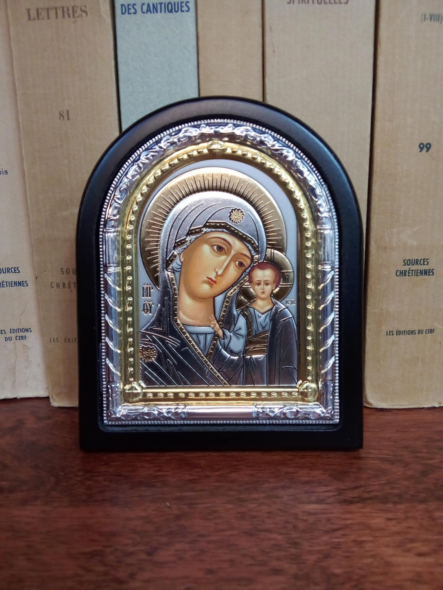 Avaleht/Jumalaema (Kaasani) ikoon (musta raamiga, ca 10,7 x 8,7 cm)