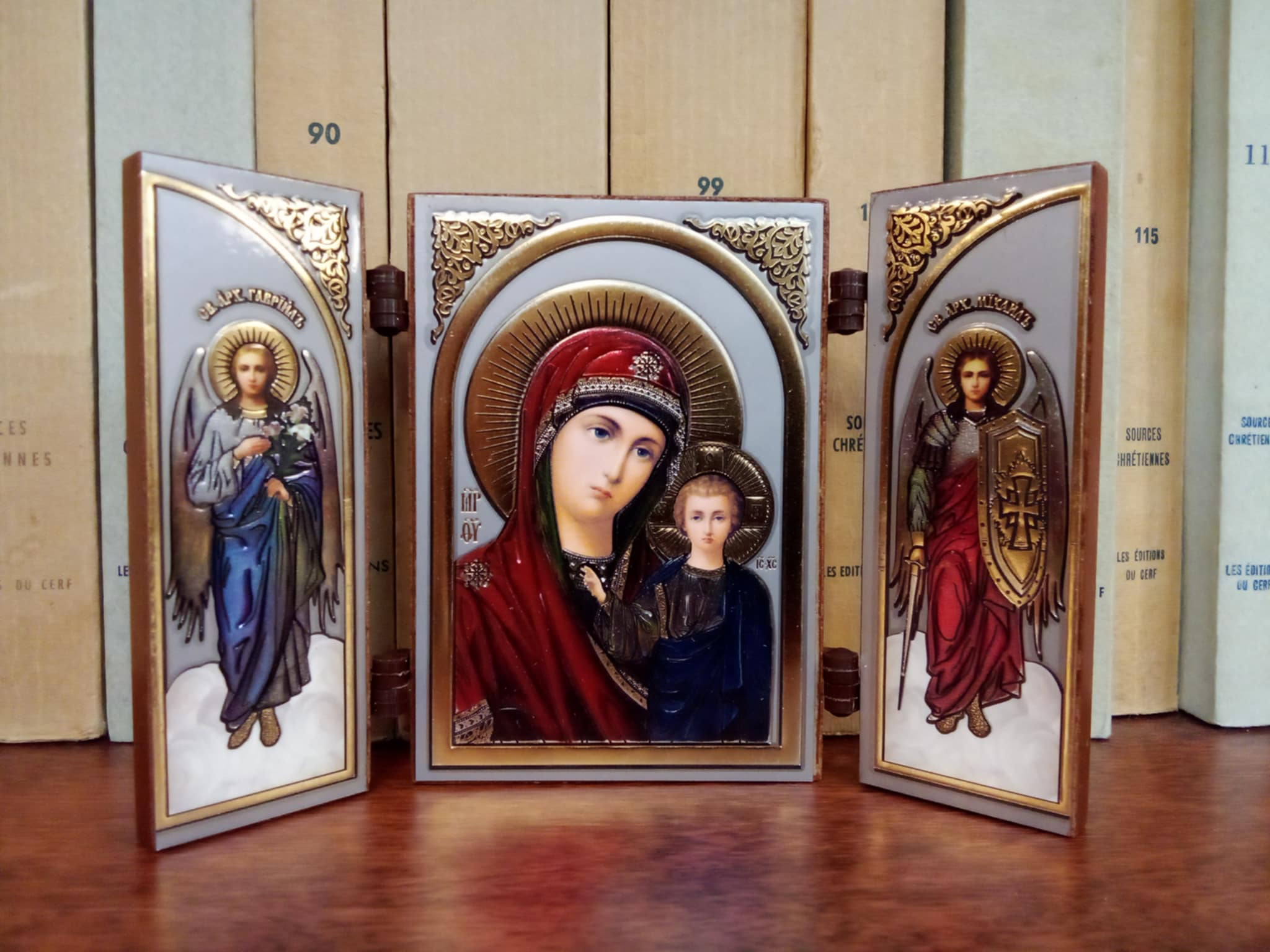 Jumalaema kokkupandav ikoon, kahel pool inglid Miikael ja Kaabriel. Keskse ikoonitahvli mõõtmed ca 8,5 x 6 cm.