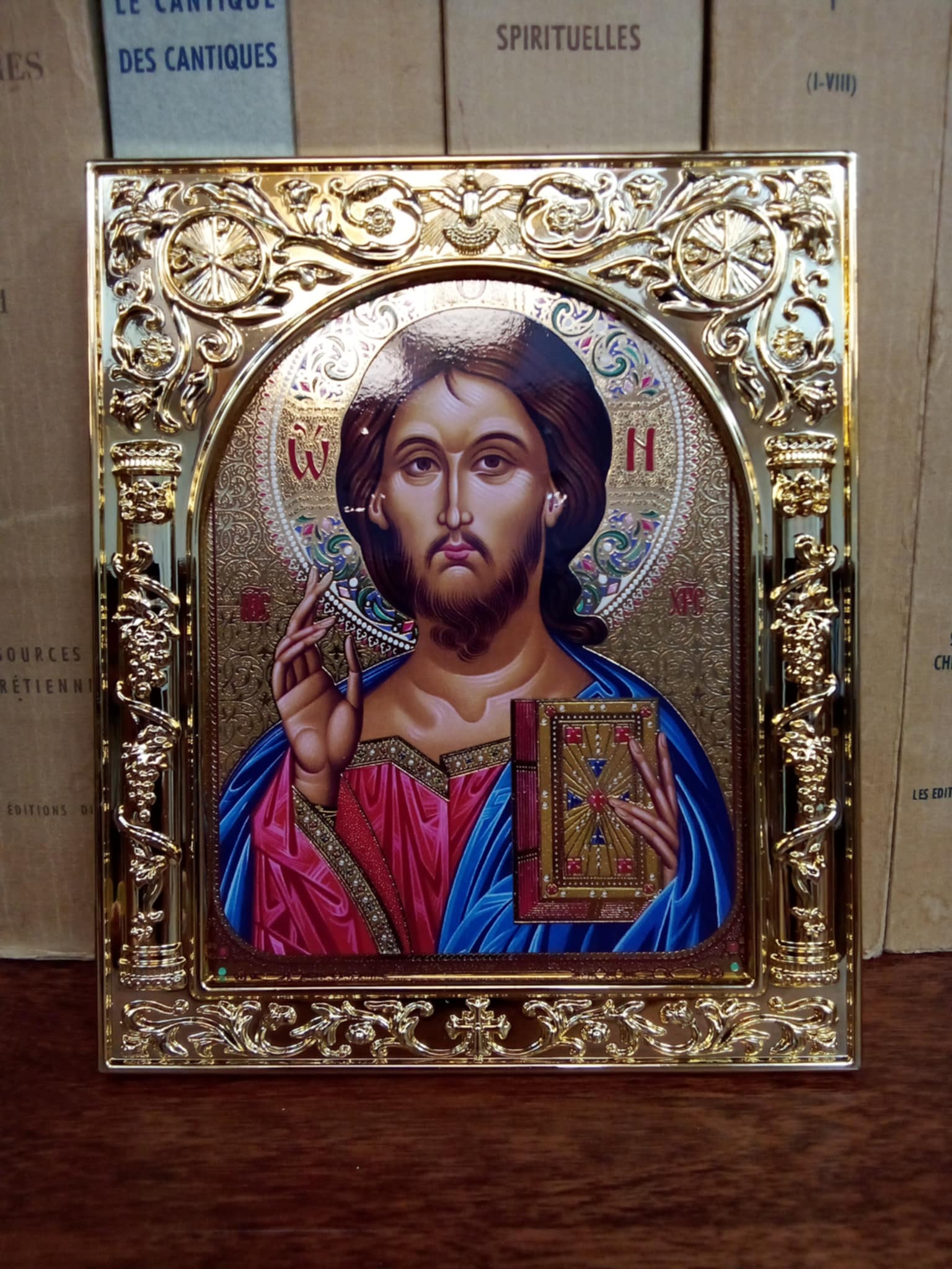 Kristuse ikoon kuldses raamis. Lauale toetuva jalaga.