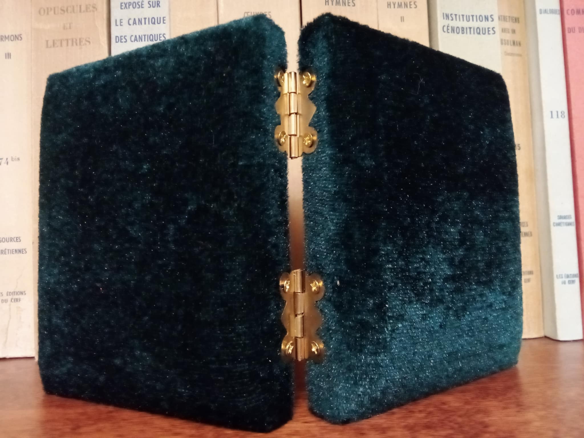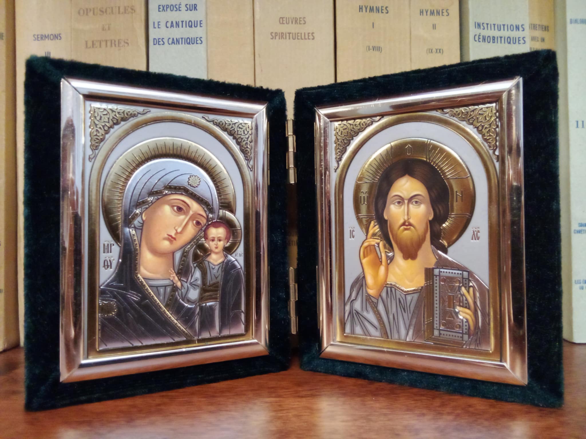 Kristuse ja Jumalaema kokkupandav kaksikikoon. Tumerohelise riidega kaetud kaaned.