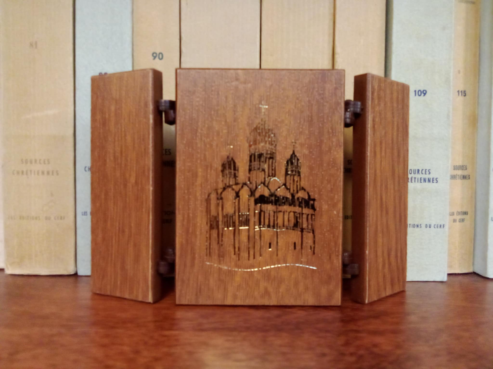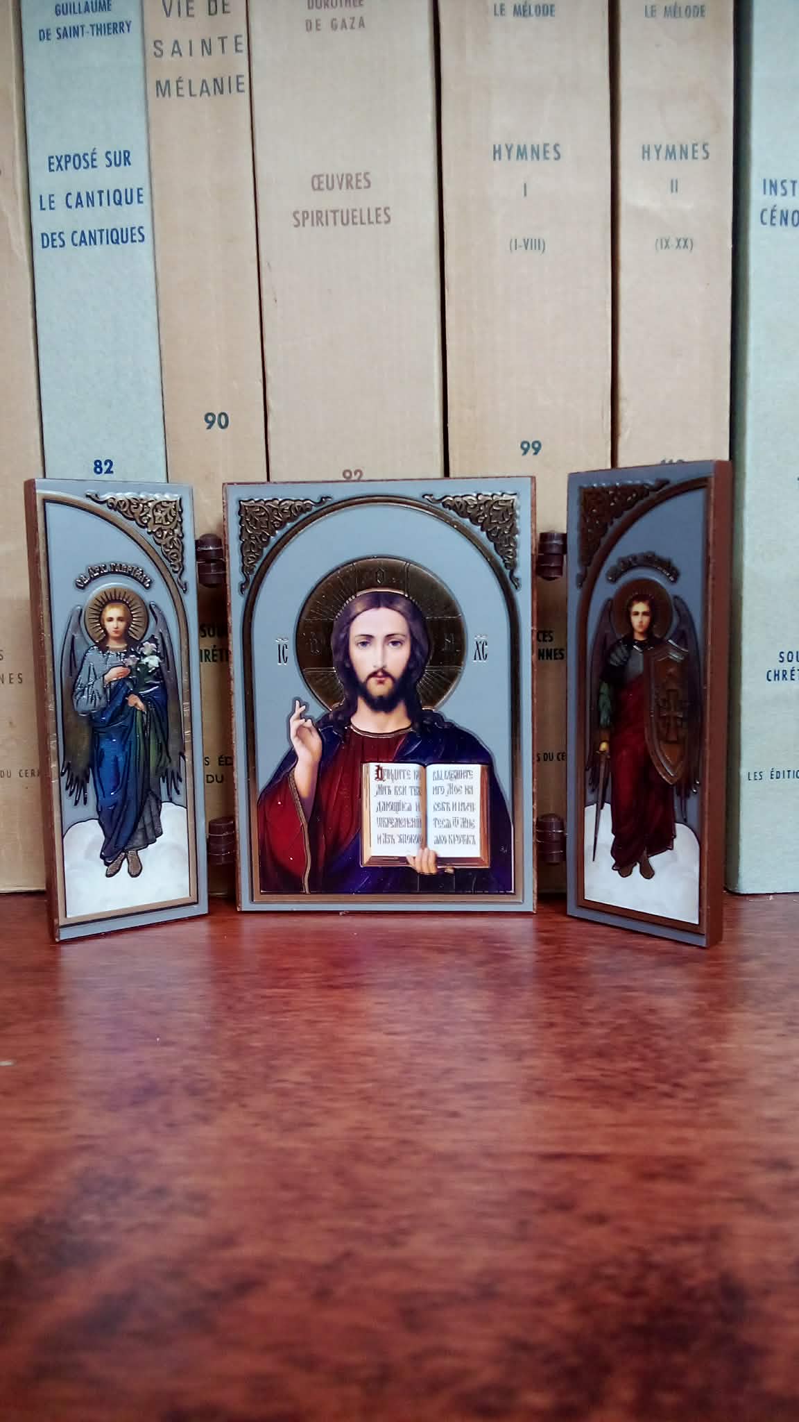 Kristuse kokkupandav ikoon, kahel pool inglid Miikael ja Kaabriel. Keskse ikoonitahvli mõõtmed ca 8,5 x 6 cm.