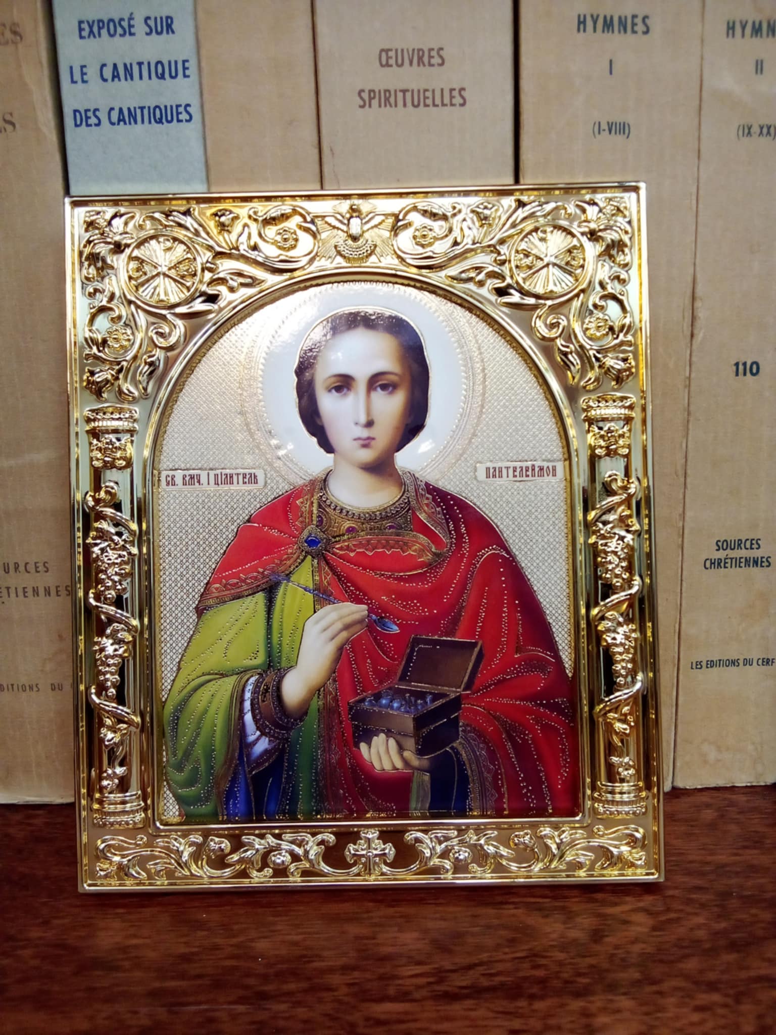 Püha Panteleimoni ikoon kuldses raamis. Lauale toetuva jalaga.