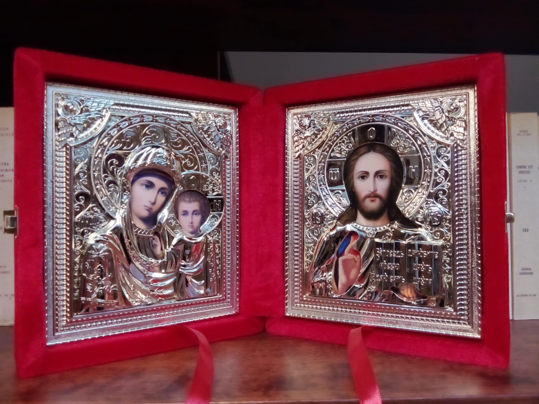 Suur Kristuse ja Jumalaema kokkupandav kaksikikoon. Erepunase kangaga kaetud kaaned.