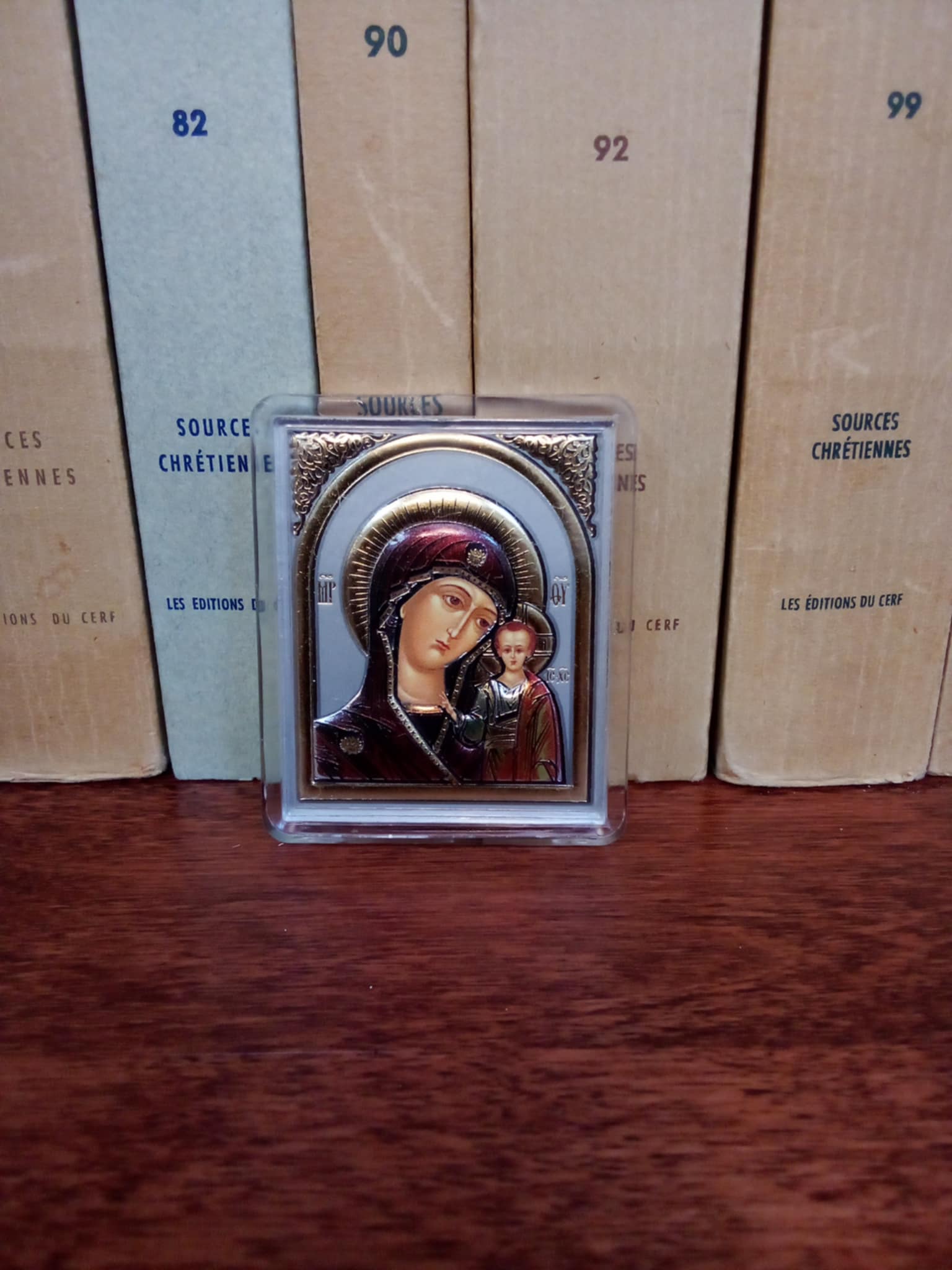 Väike Jumalaema ikoon, kleebitav, lauale toetuva jalaga.