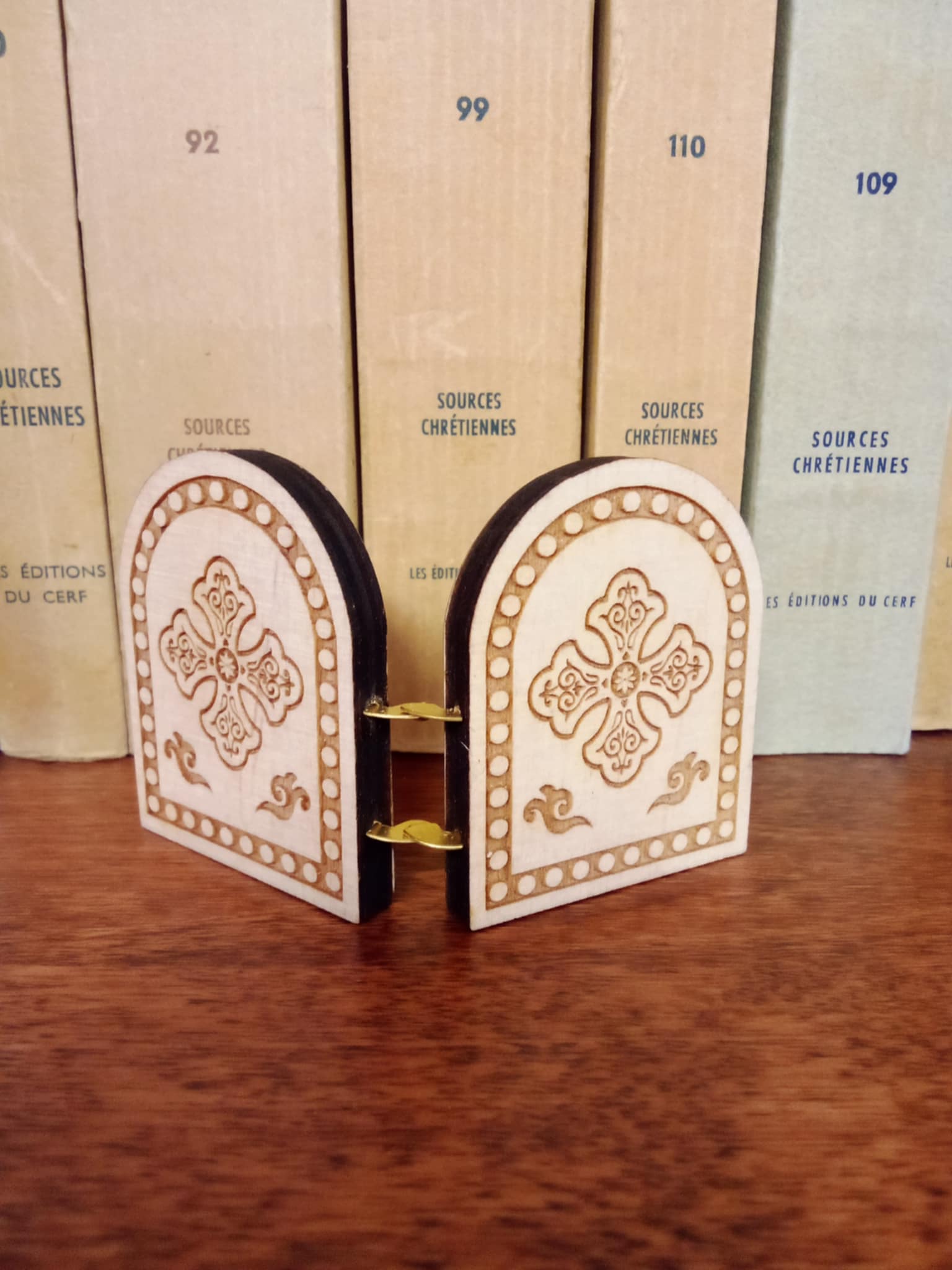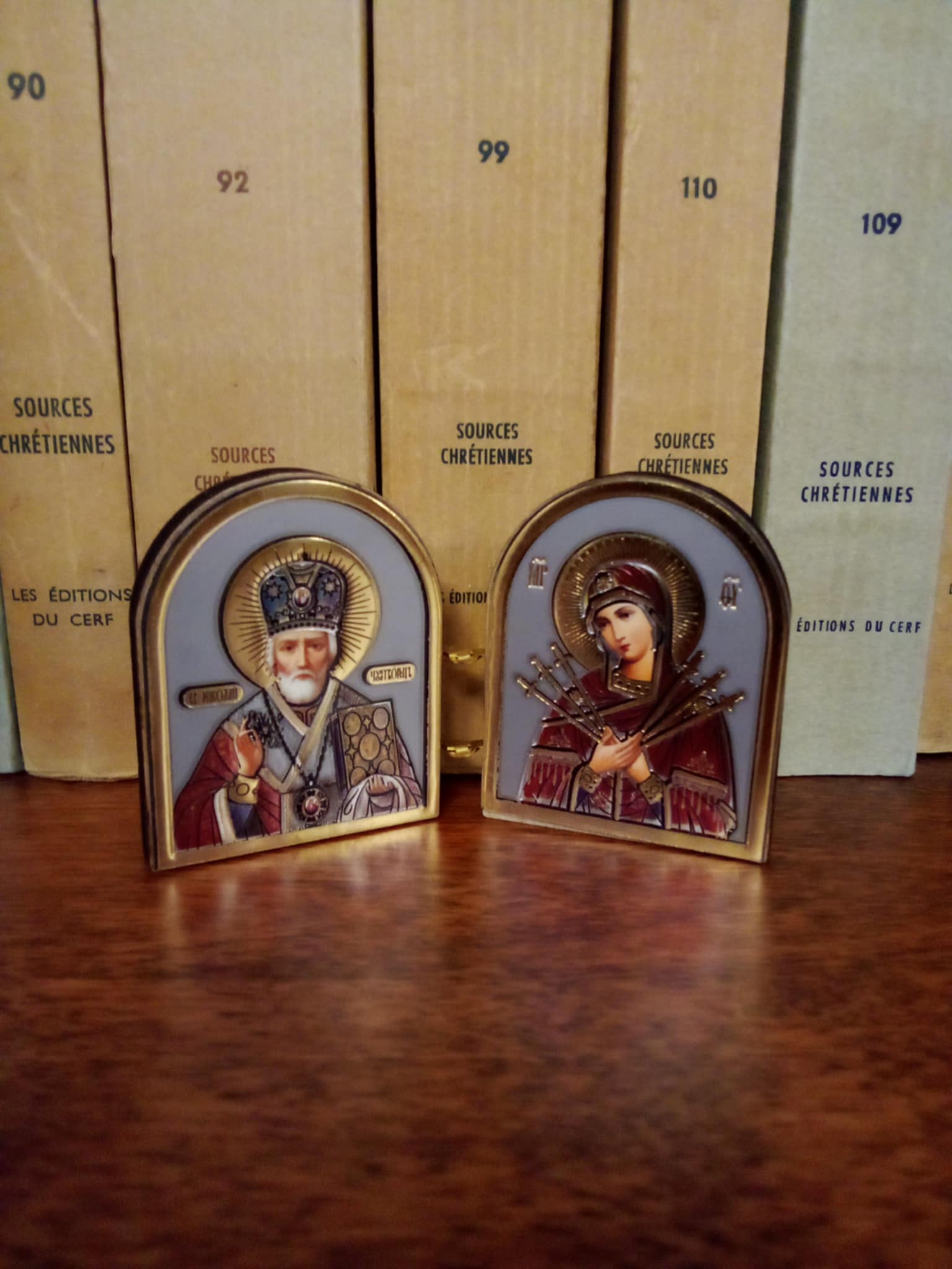 Väike Jumalaema ja püha Nikolai kokkupandav kaksikikoon, ühe ikoonitahvli mõõtmed ca 5 x 4 cm.