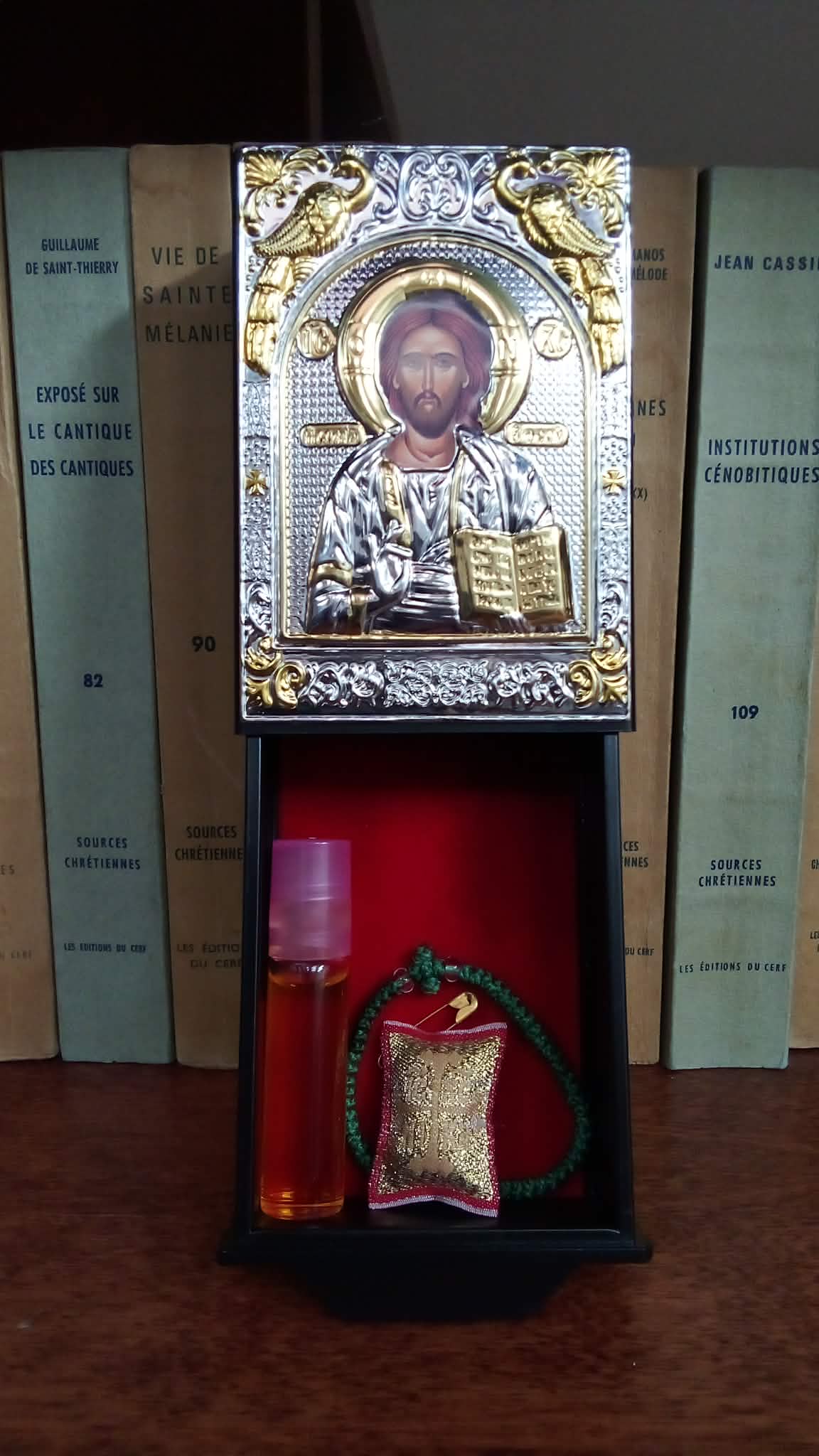 Kristuse ikooniga kinkekarp, sahtlis palvenöör-käevõru (varieerub), ohutis, roosiõli.