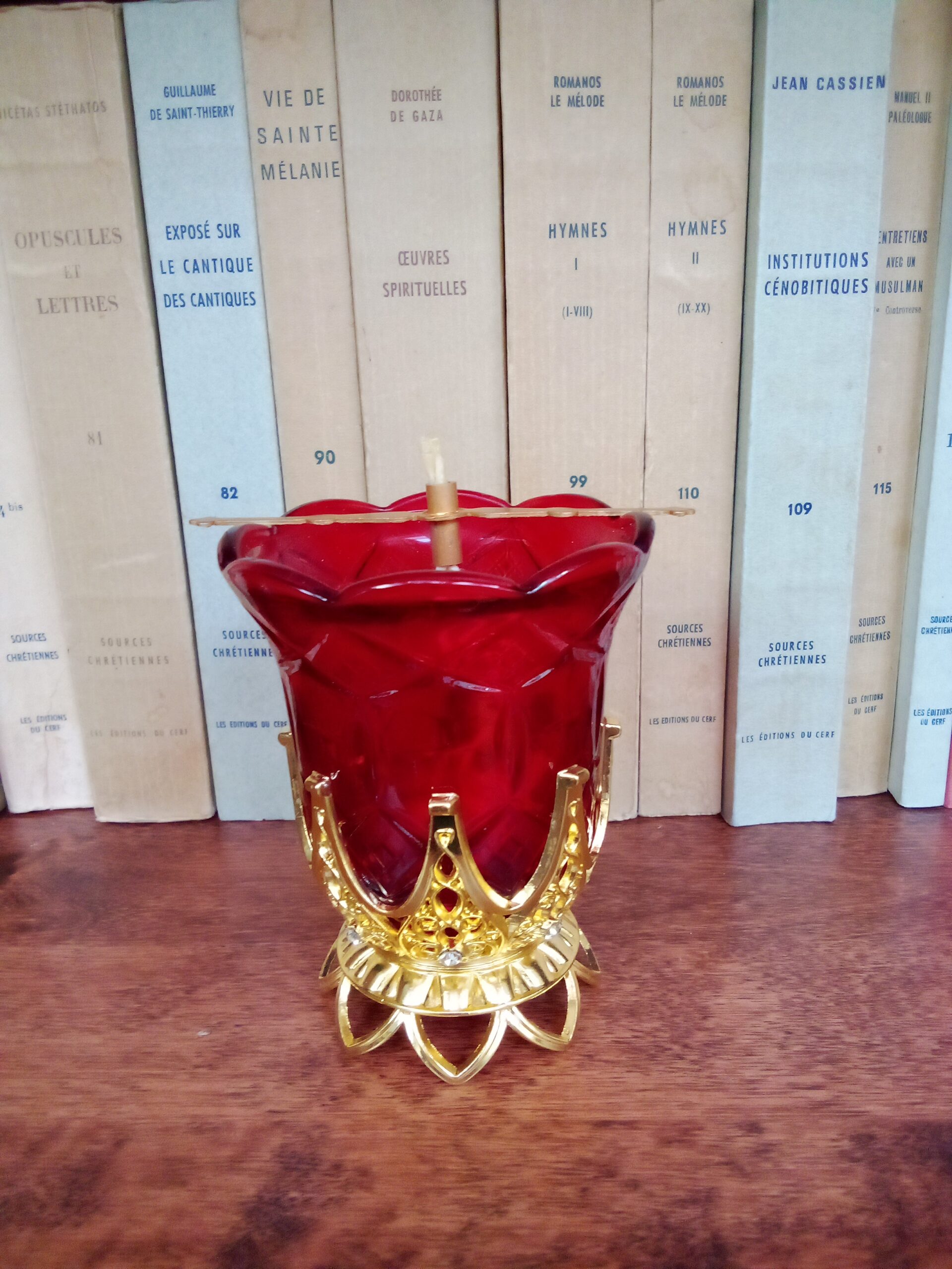 Punane klaasist õlilamp koos tahi ja tahihoidajaga.