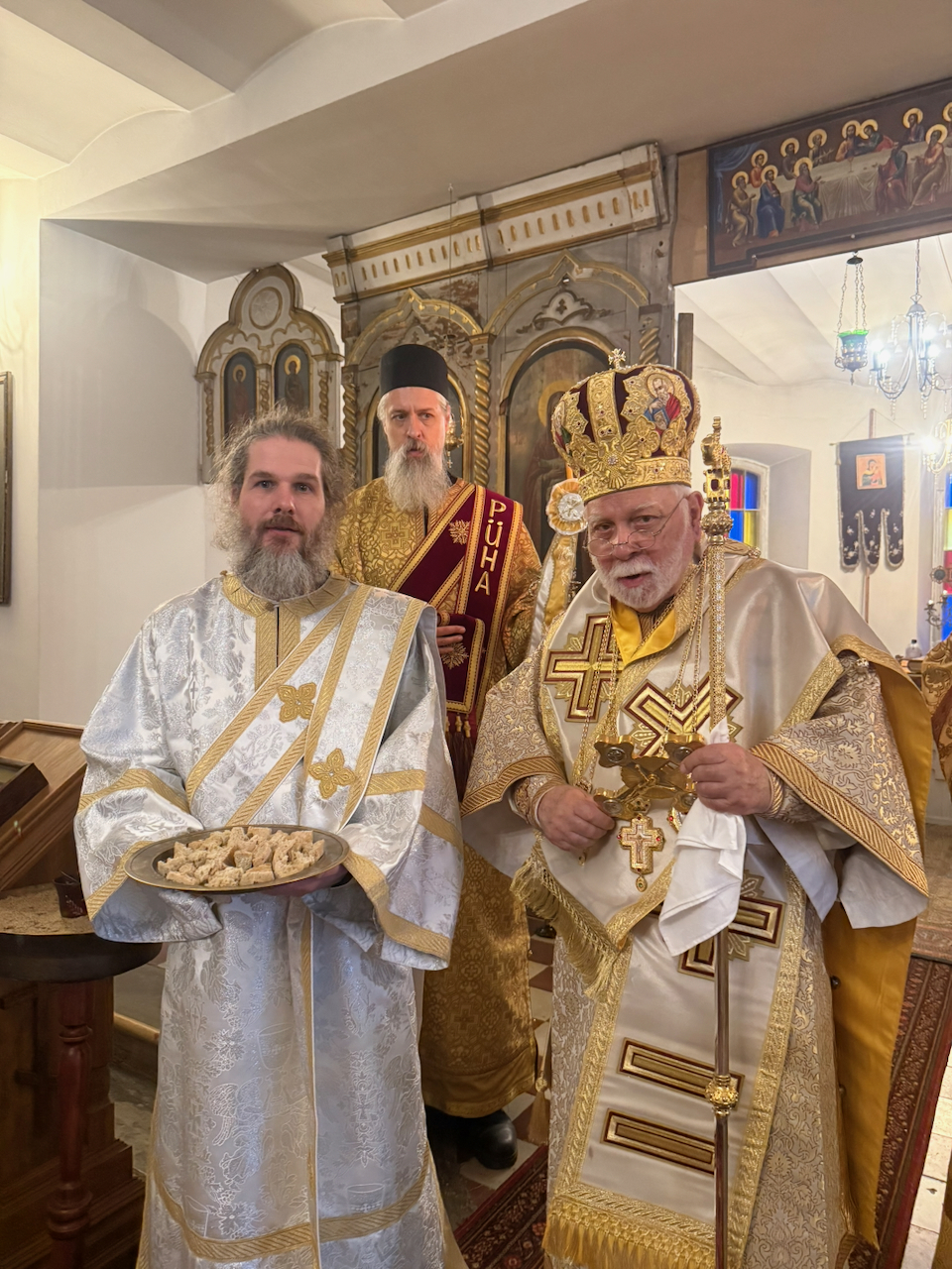 Metropoliit Stefanus (paremal), äsjapühitsetud diakon Taaniel Kosk (vasakul) ning arhidiakon Marius Raudsepp (taustal). Foto: Kristjan Otsmann.